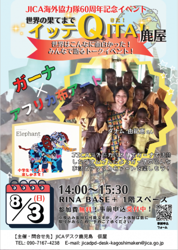 紹介文:JICA海外協力隊事業60周年を記念し、世界で活躍した隊員によるトークイベント「世界の果てまでイッテQITA!」を開催します。今回は、ガーナに派遣されたダナム由紀恵さんに、ガーナの文化や活動についてお聞きし、アフリカ布を使ったアート作りを体験します。ガーナを見て、聞いて、体感する、小学生~大人まで幅広い方にお楽しみいただける内容となっておりますので、お気軽にご参加ください。