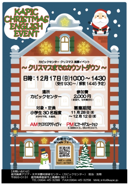 内容:外国人の先生方と英語で触れ合いながら、クリスマスのアクティビティやミニケーキのデコレーションをしよう!
